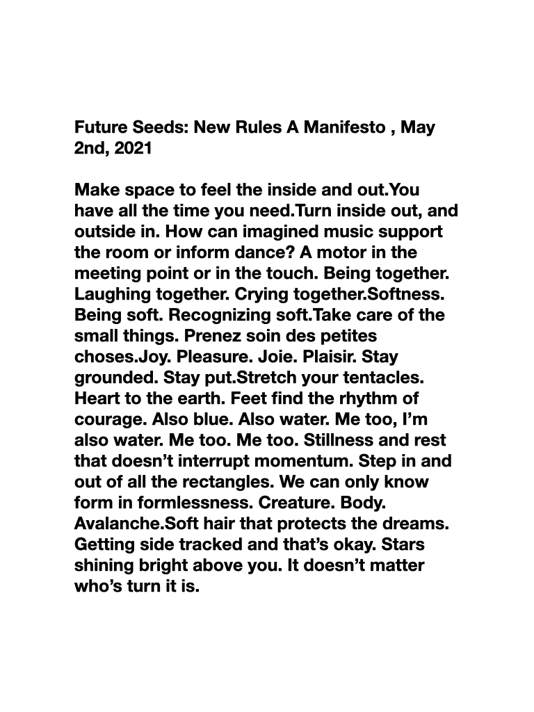 The creation of 101.3, Future Seeds took place during a workshop lead by LFDT Director, Wynn Holmes, on May 2, 2021 as part of the Expanded Workshop Series hosted by the CCOV and LeParc. Titled 101.3, Who Says So, this workshop marked the beginning of the process, articulation, and creation of the fourth act within LFDTLAB’s 101 Series – an ongoing process-based performance project that explores the LFDTCLASS structure in different performance settings with each act informed by a different theme or idea. Rooted in the experimental and DIY ethos, this series was founded in the spirit of making work under any and all circumstances – challenging the rules of engagement by working with artists and audiences in making dance, performance, and art happen when, where, and however we can.