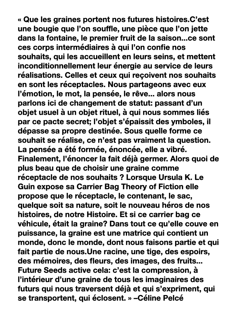 The prompts/wishes/new rules/seed names found in the transcript are offerings from workshop participants which have been compiled into a manifesto. Also included is an introduction from French food artist and designer, Céline Pelcé, which was written a couple of weeks after the workshop took place. Céline and LFDT have been collaborating from a distance this past year – between Paris and New York – and this exercise was greatly inspired by our ongoing project research.